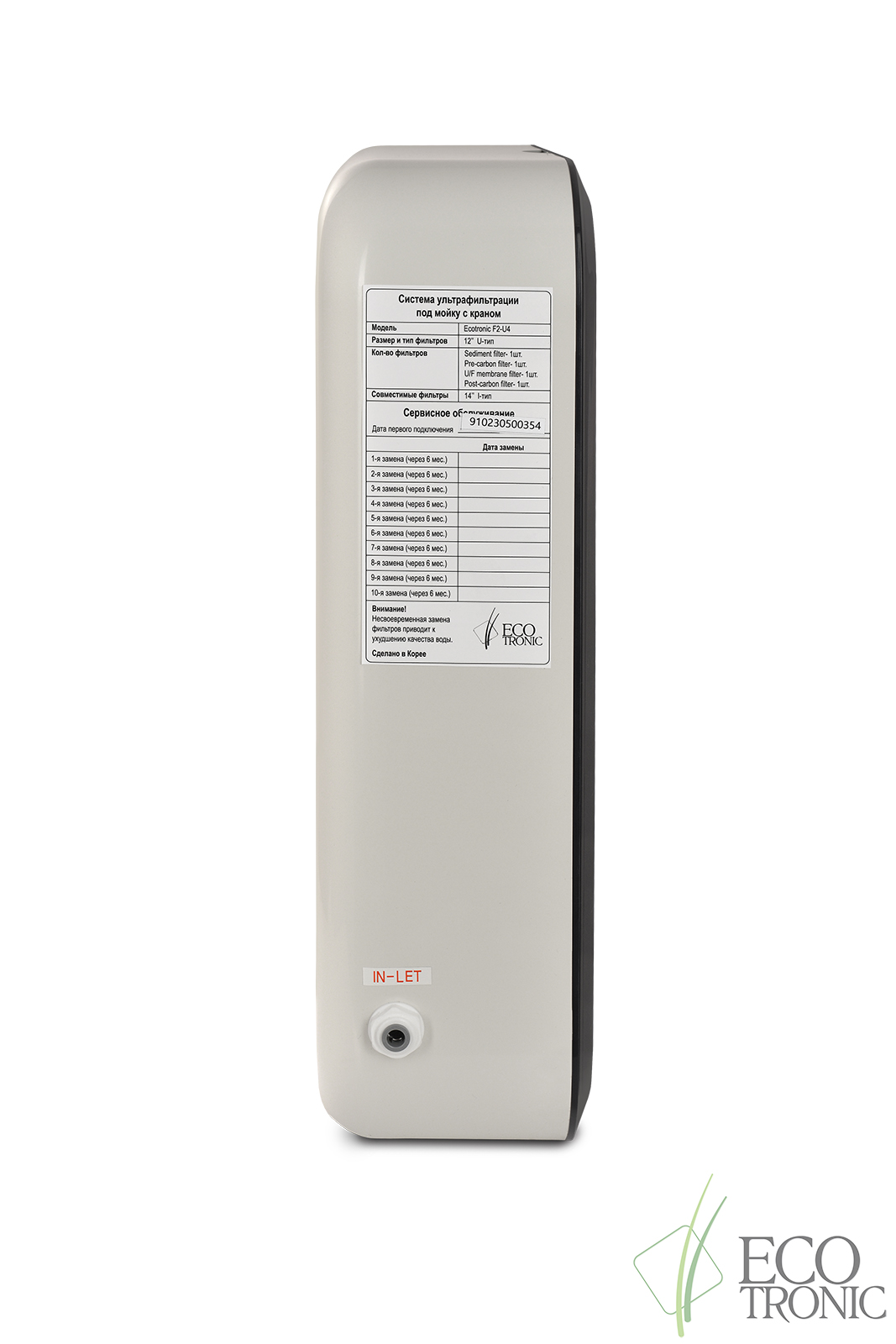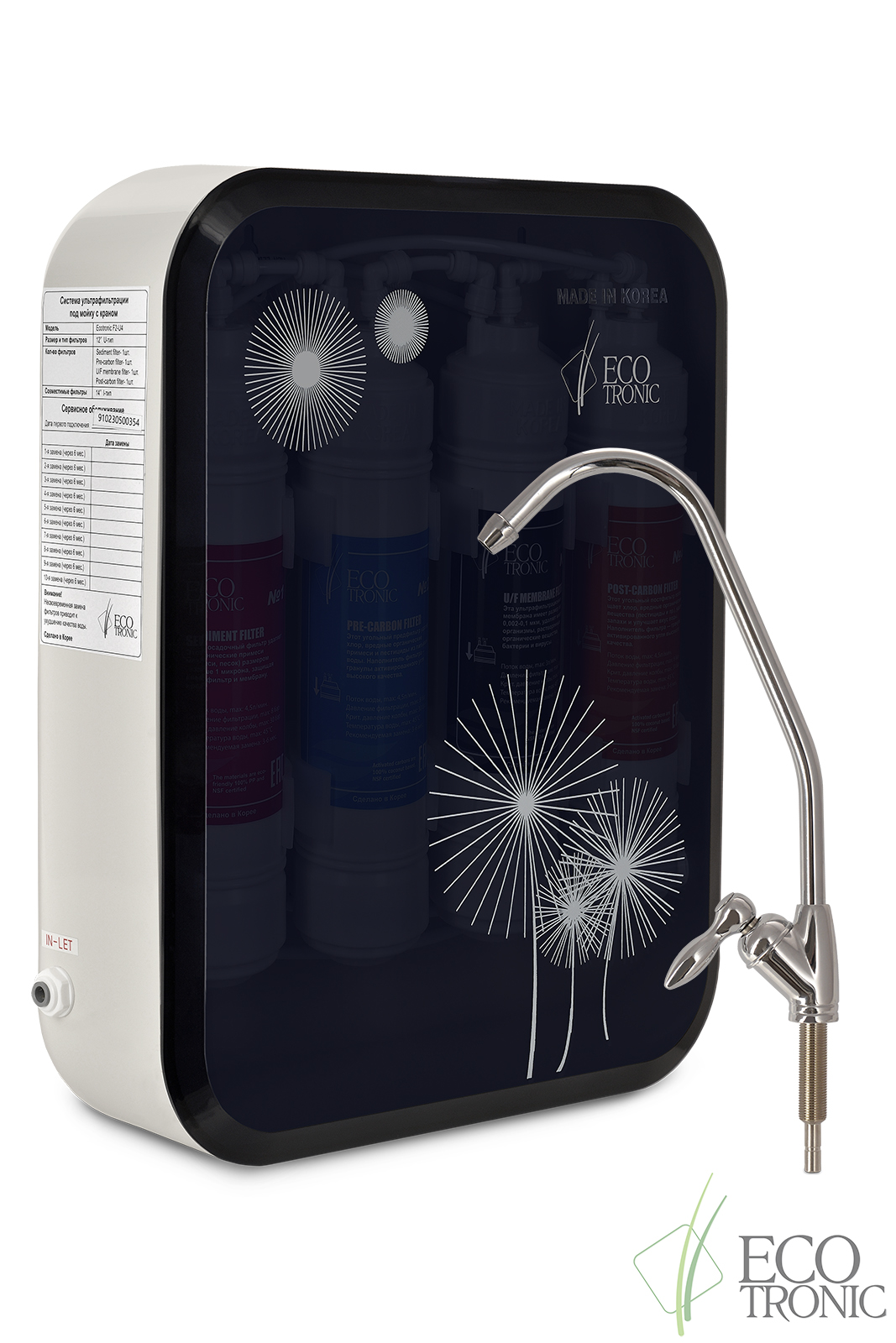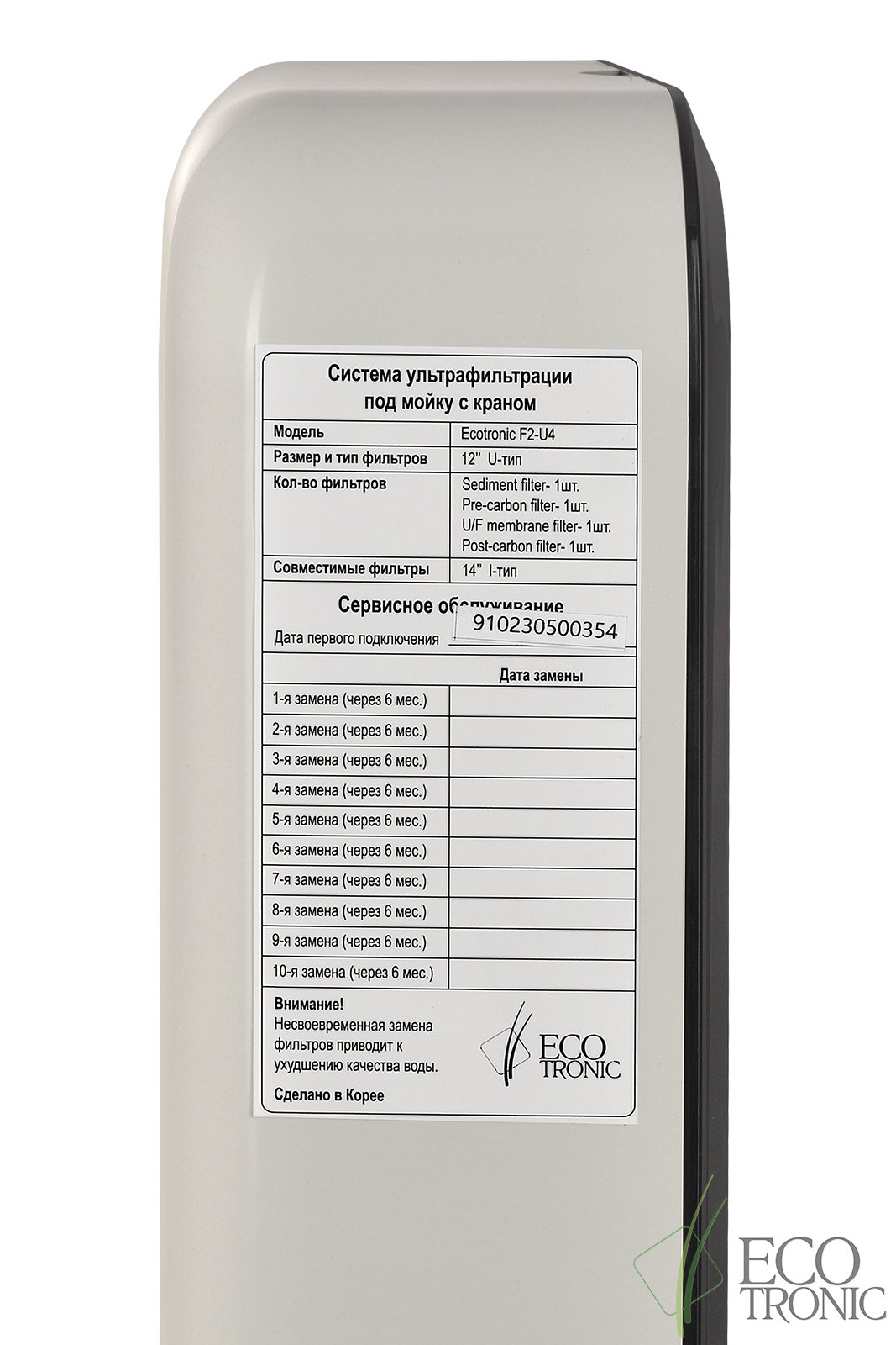 Система ультрафильтрации под мойку Ecotronic F2-U4 для подключения к водопроводу холодной воды. Благодаря качественным фильтрам Ecotronic пр-ва Юж. Корея, а главное, ультрафильтрационной мембране (фильтр №3) в ее составе система позволяет получить очищенную питьевую воду высокого качества без примесей, неприятных запахов, бактерий, органики и осадка, с приятным послевкусием.
