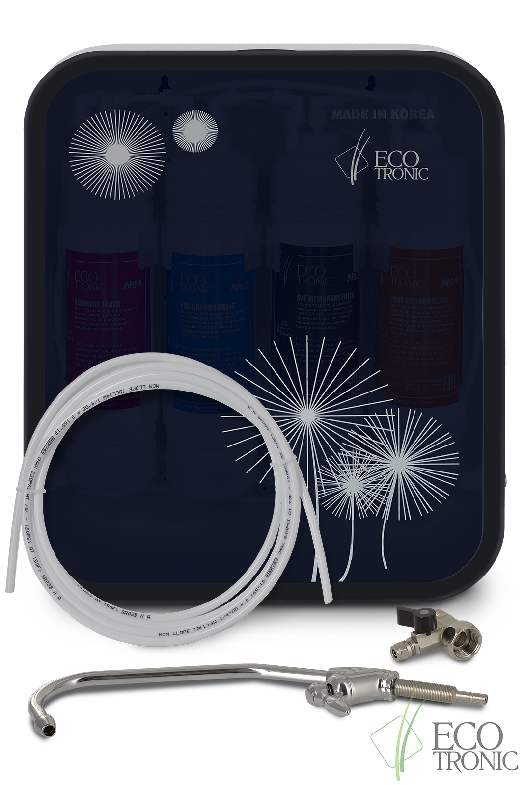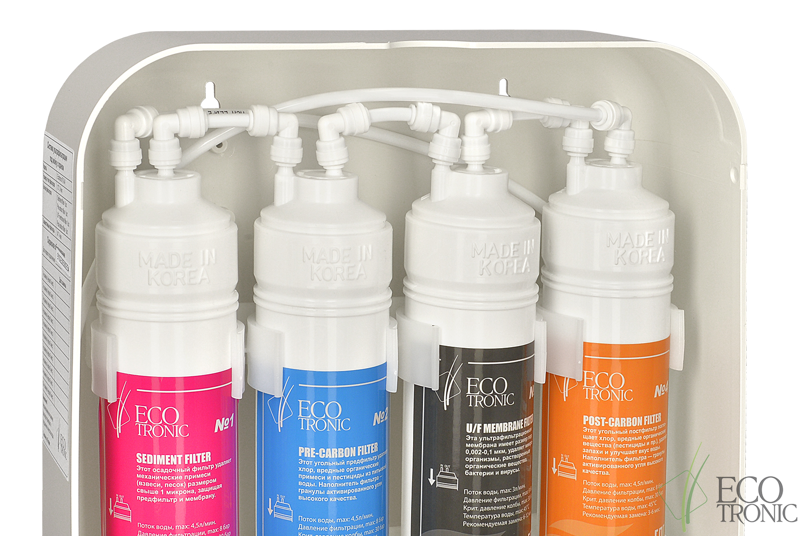 Используются следующие ступени очистки: осадочный фильтр (Ecotronic Sediment 12"), угольный префильтр (Ecotronic Prefilter 12", ультрафильтрационная мембрана (Ecotronic UF memrane 12"), пост-карбоновый фильтр (Post-carbon filter 12"). Можно устанавливать фильтры типоразмеров 12" и 14" (дюймов).