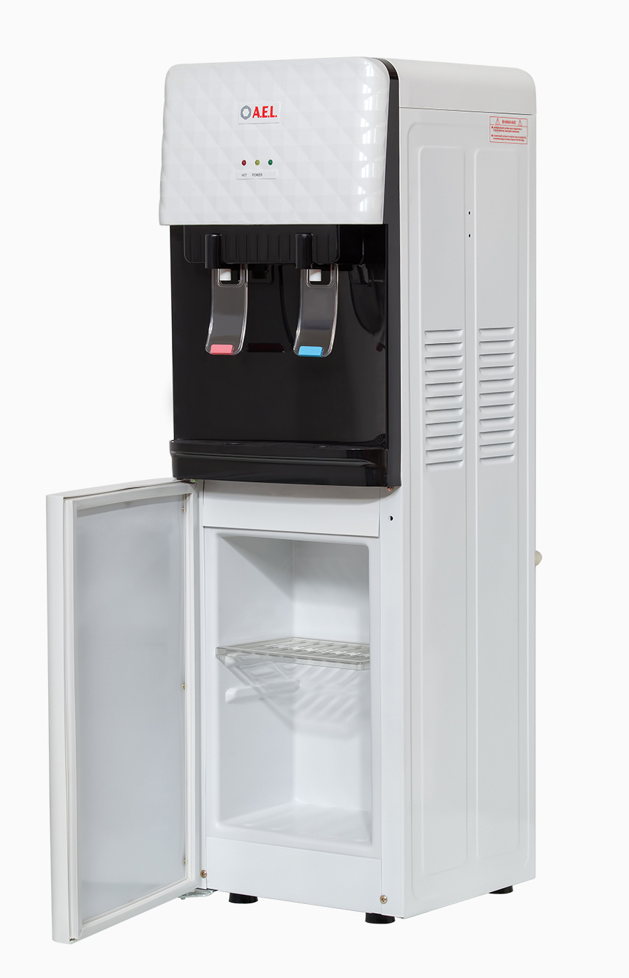 ОписаниеПредставляем новинку в ассортименте АЕЛ недорогой напольный кулер для воды с верхней загрузкой бутыли в корпусе белого цвета с черными вставками. Модель без охлаждения, с нагревом 5л/ч и шкафчиком для продуктов. Интересный дизайн на лицевой панели, удобные краны "нажим чашкой" и малые габариты этого аппарата эргономично впишутся в Ваш офис.