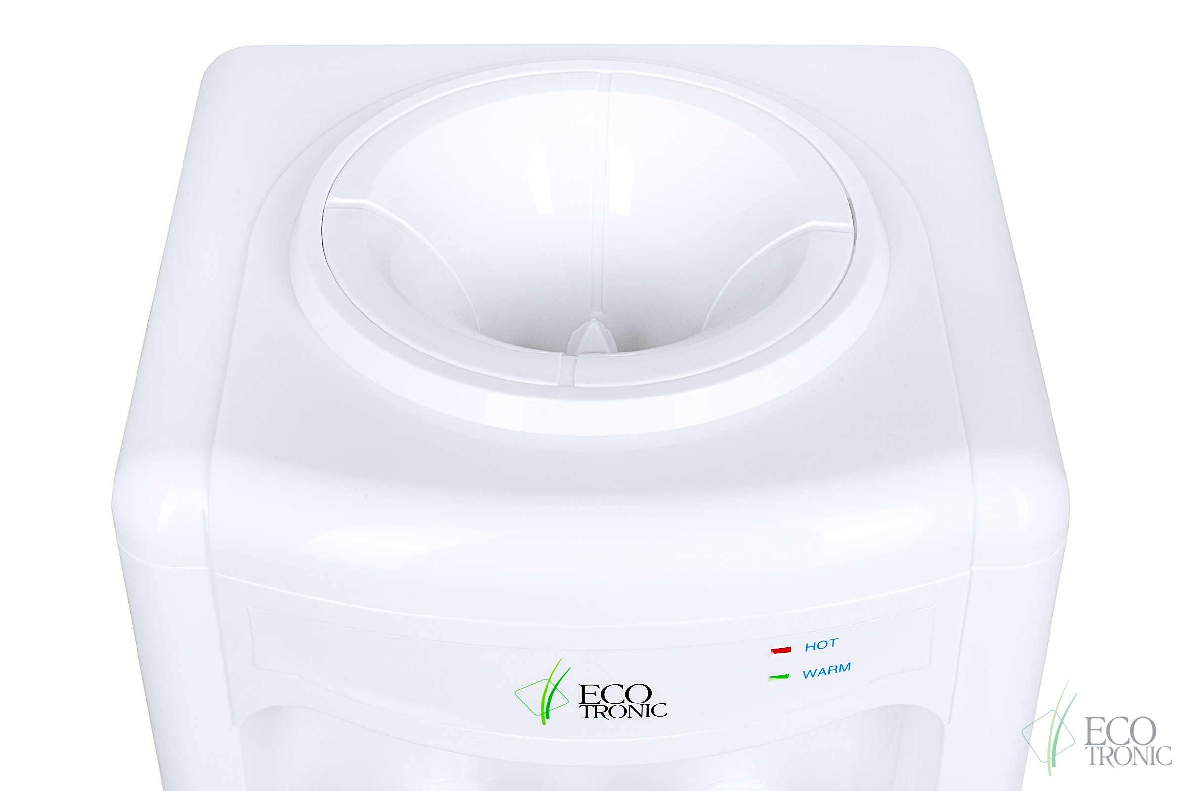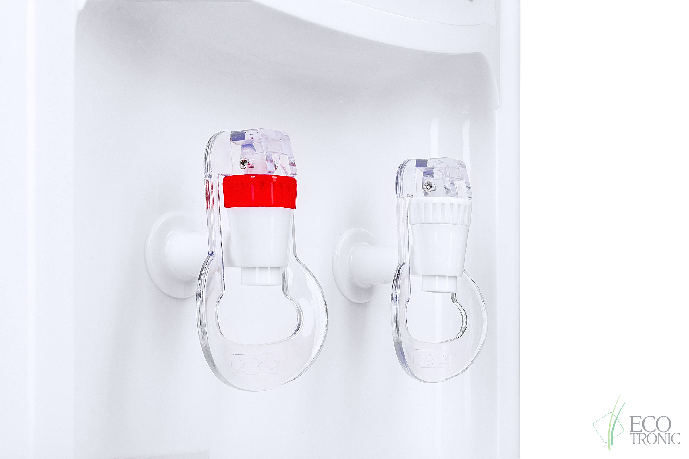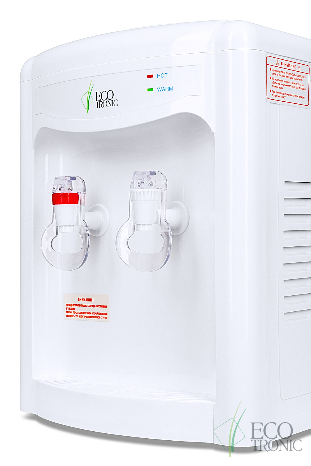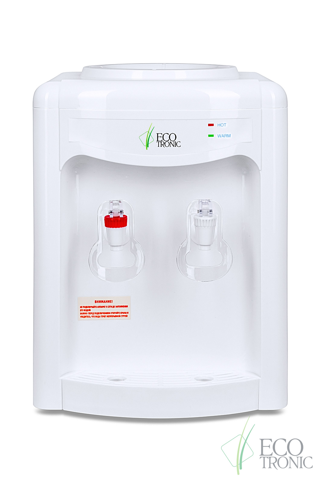 Настольный кулер без охлаждения, только нагрев. Бюджетная модель с доступной ценой. Белый пластиковый корпус, краны "Нажим кружкой": с красной маркировкой для горячей воды и с белой для воды комнатной температуры.