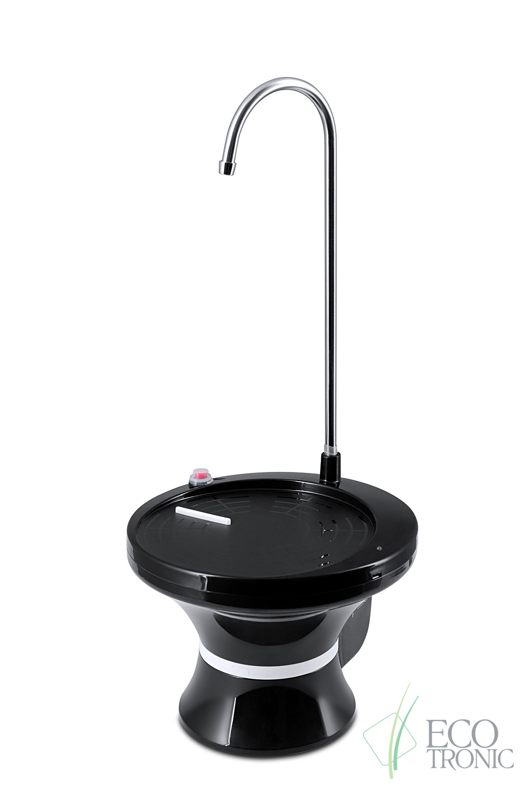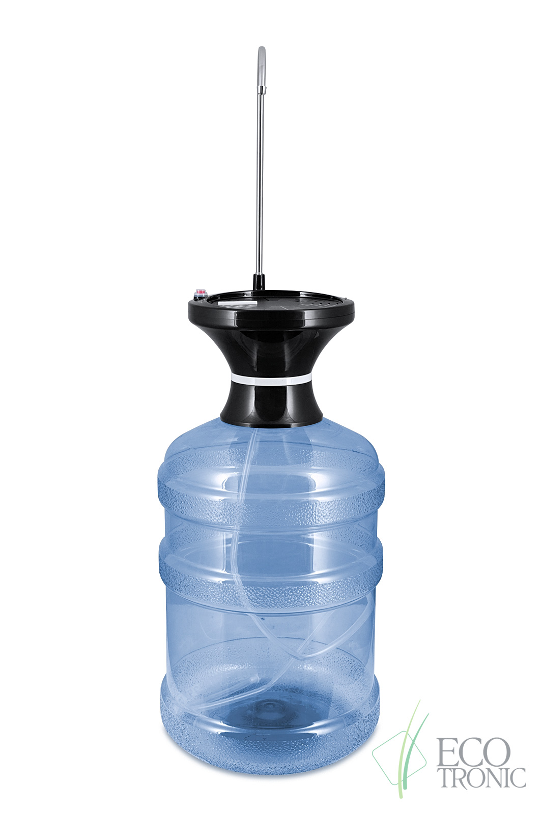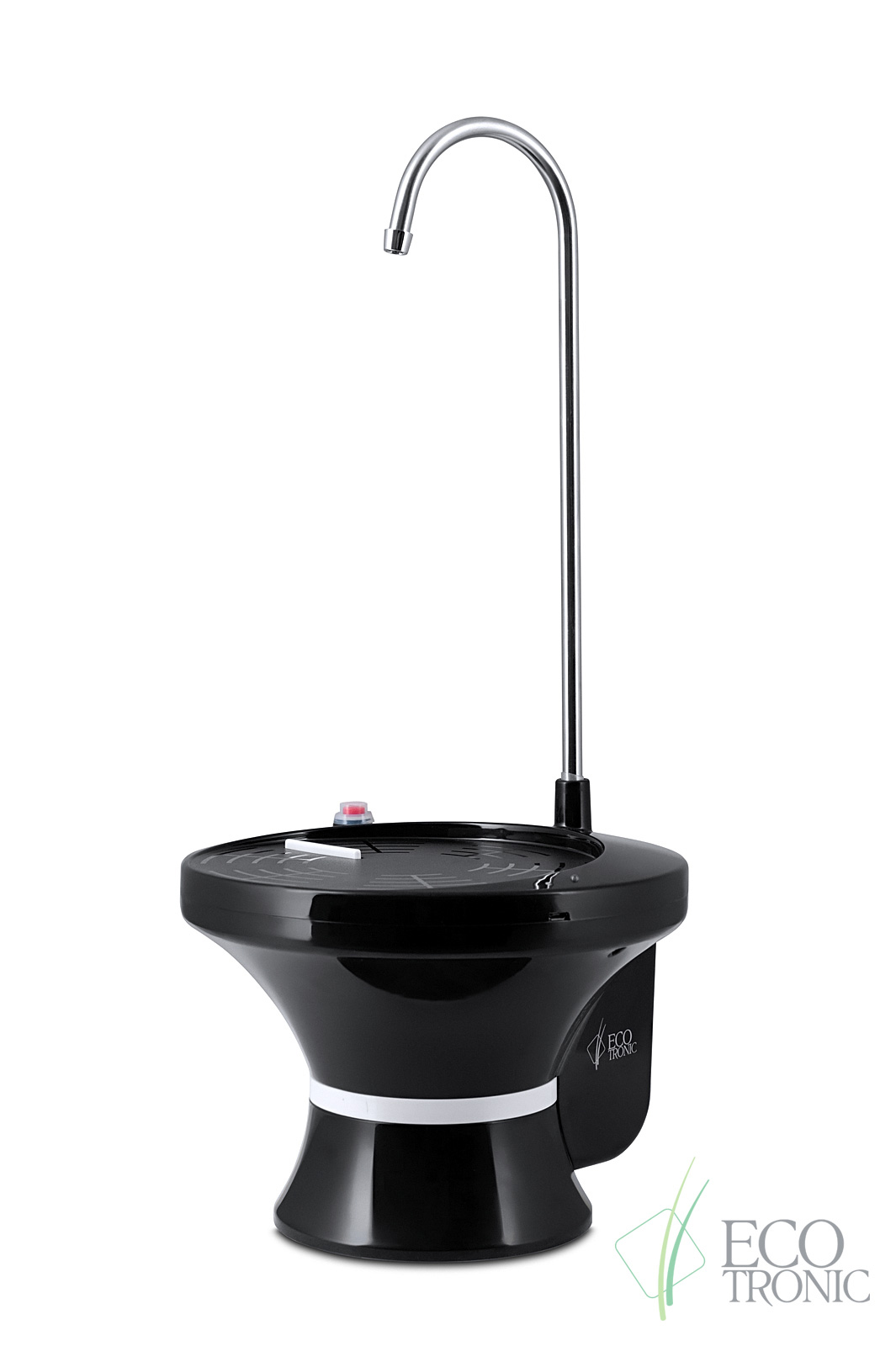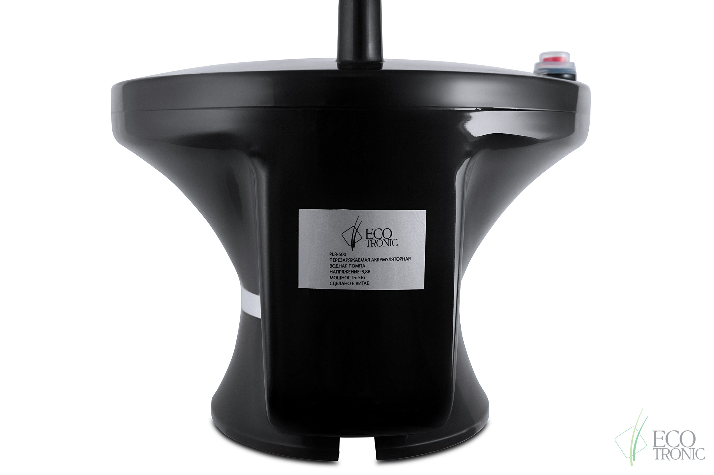Электрическая перезаряжаемая водная помпа-подставка Ecotronic PLR-500. Устанавливается либо непосредственно на бутыль 19 л, либо на столешницу с удаленным забором воды с помощью гибкой трубки. Трубка позволяет забирать воду без остатка. Заряжается от сети с помощью мини-USB шнура. На помпе имеется индикатор заряда. Подача воды ручная или автоматическая.