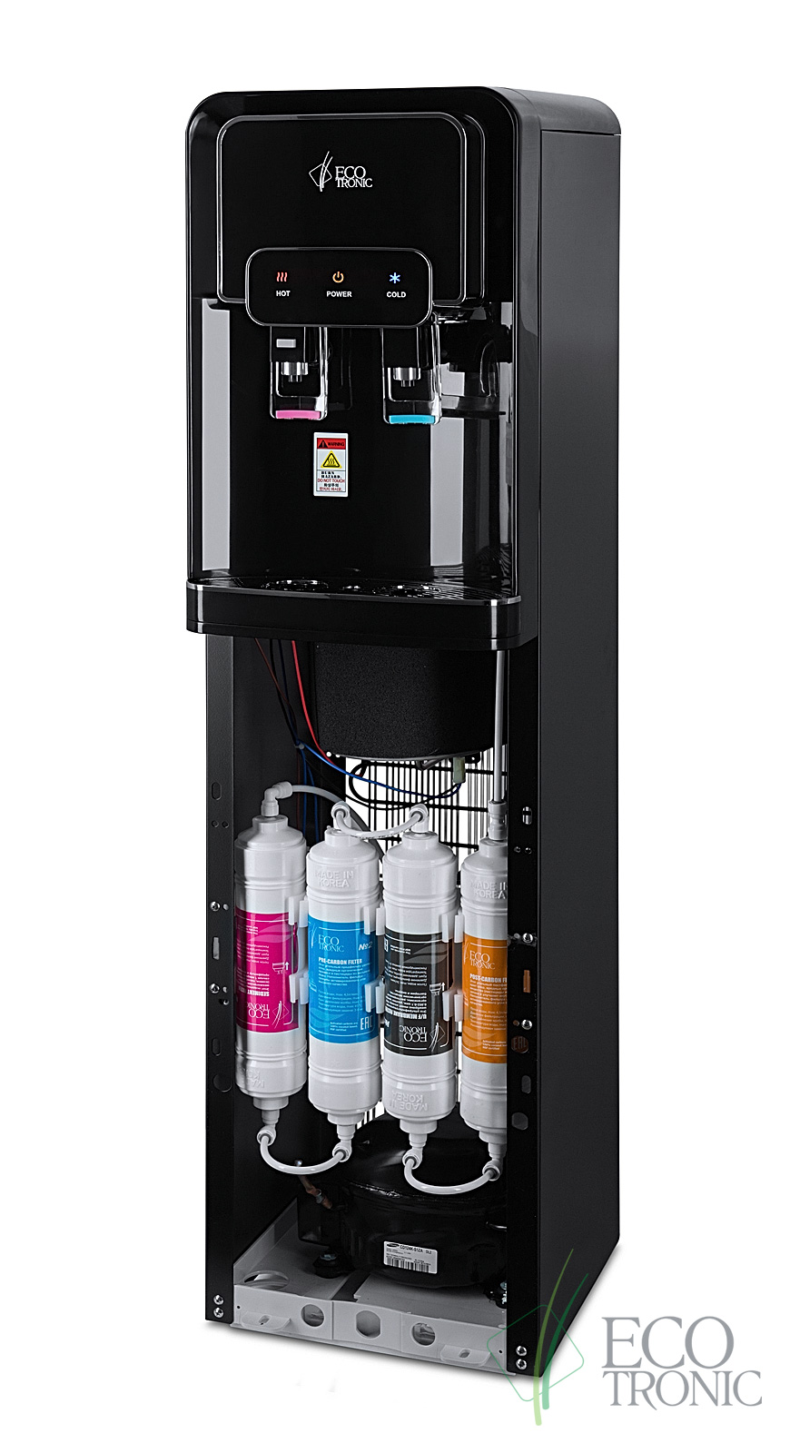 Пурифайер напольного типа с ультрафильтрационной системой очистки воды. Бак холодной воды цельнотянутый, емкостью 7 л. Бак горячей воды также 7 л. Мощность нагревательного элемента 770 Вт. Защита на кране горячей воды. Краны "нажим кружкой". Выглючатели нагрева и охлаждения сзади на корпусе. Цвет корпуса черный. Производство: Корея.